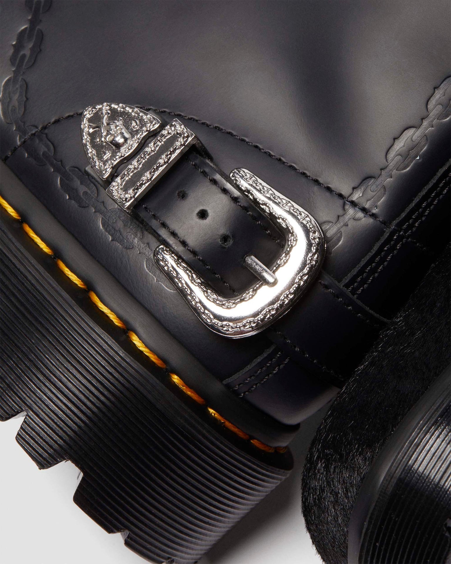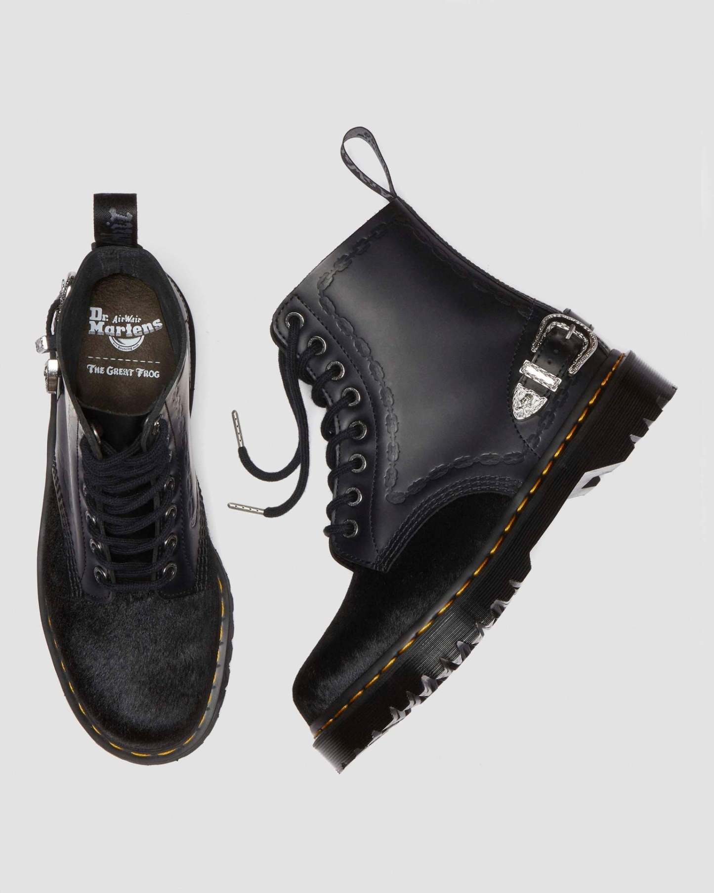 Our second collaboration with London jeweller The Great Frog includes this reworked version of our classic 1460 boot. Made from black Smooth leather with a Hair On vamp, with hardware engraved by TGF Creative Director Reino Lehtonen-Riley. The leather is detailed with debossed chain artwork, which also forms the border of the vintage-inspired silver buckle on the boot��s heel. Other silver details include metal aglets and TGF-branded eyelets. The elevated Bex sole is secured with classic DM��s yellow welt stitching, while our heel loop is signed with a charcoal script.